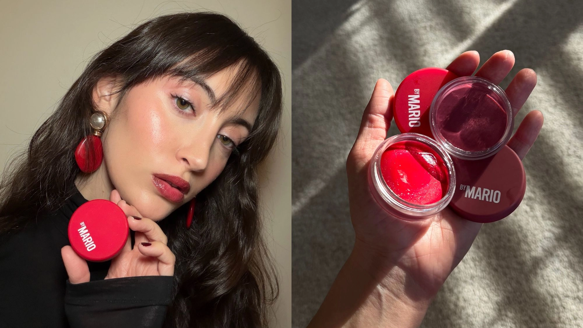 Brascia wearing the Makeup by Mario Jelly Jar in Cherry Pie (left) and Mauve Latte (right)