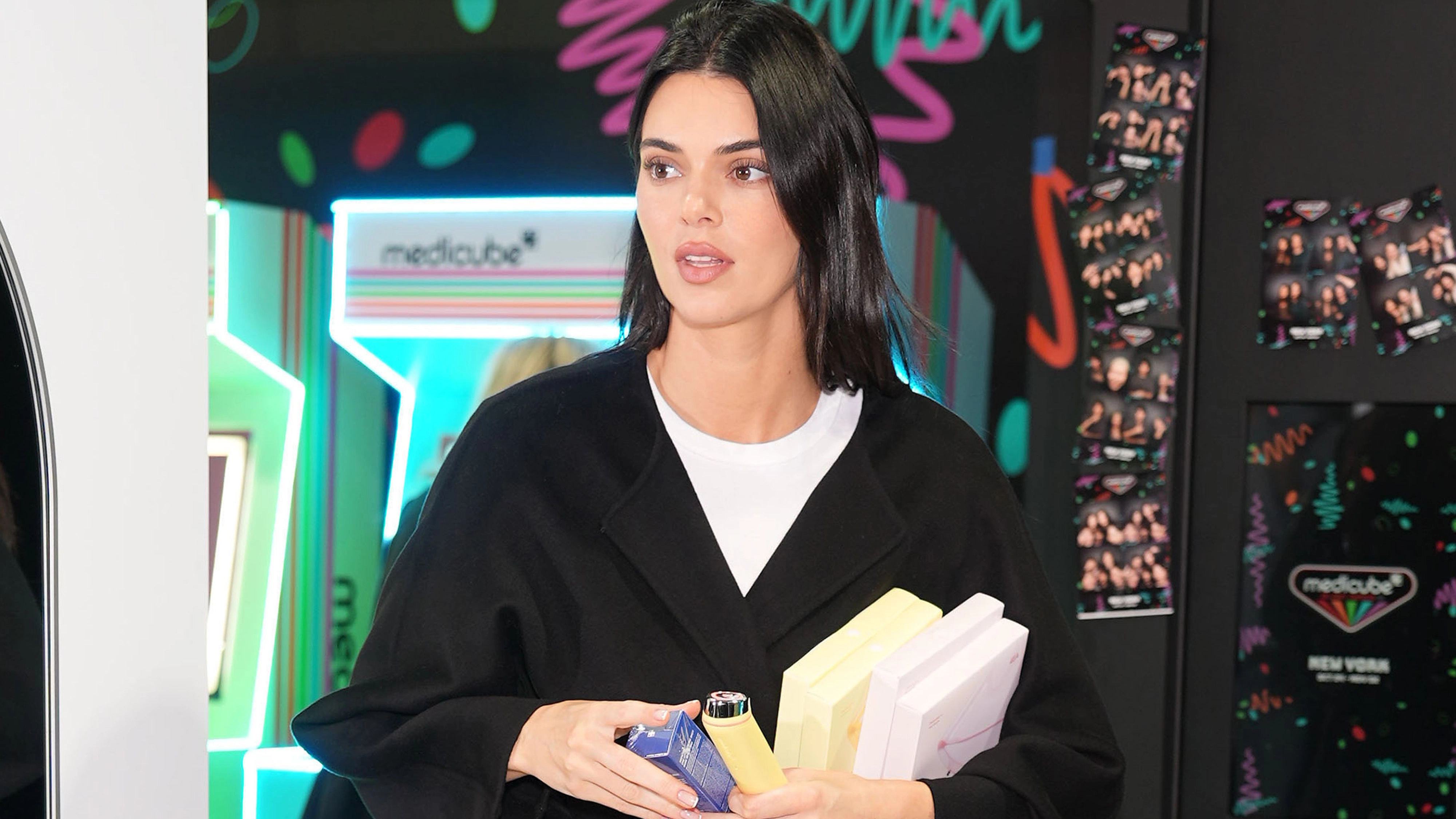 On Kendall Jenner: The Row Stella Slippers ($920), Elke Jacket ($4500), hat, jeans, bag