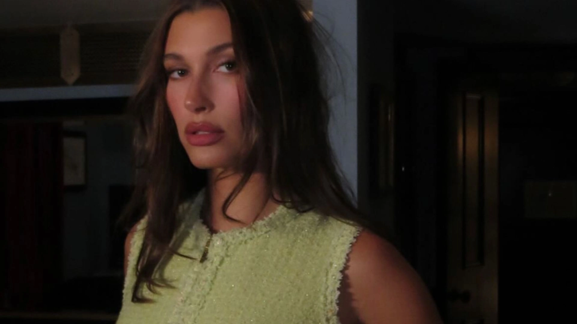 On Hailey Bieber: Vintage Chanel bouclé vest and skirt set