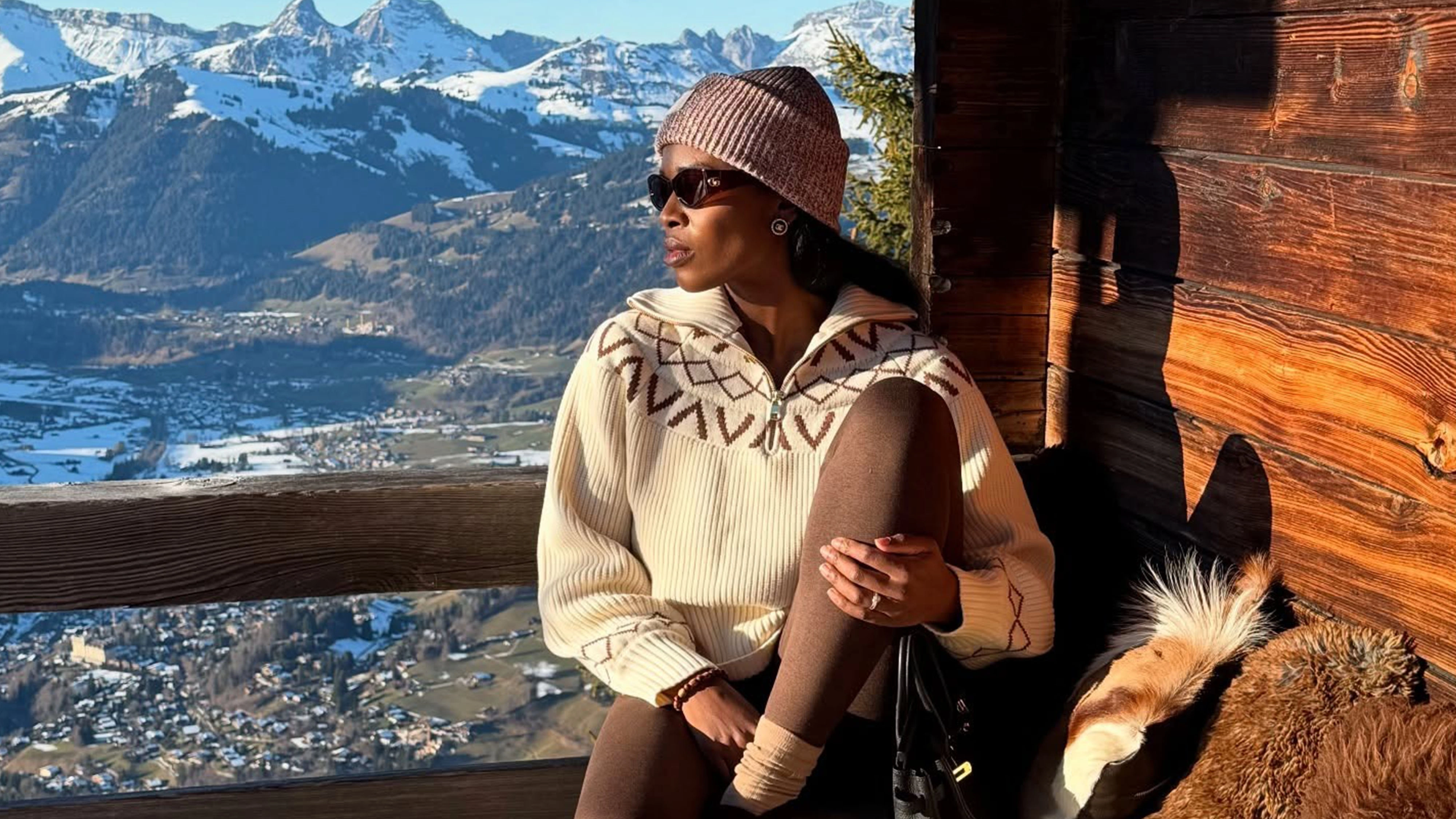 If you have Alpine travel plans this winter, leggings are the perfect piece to slip into for après ski. Just add a fairisle quarter-zip knit alongside desert booties and a beanie.