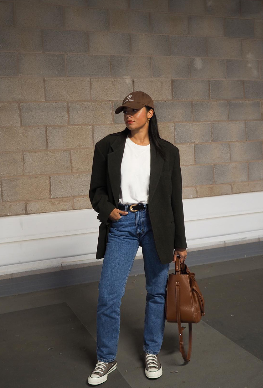 What You'll Need: Baseball Cap + Blazer + T-Shirt + Jeans + Sneakers + Handbag