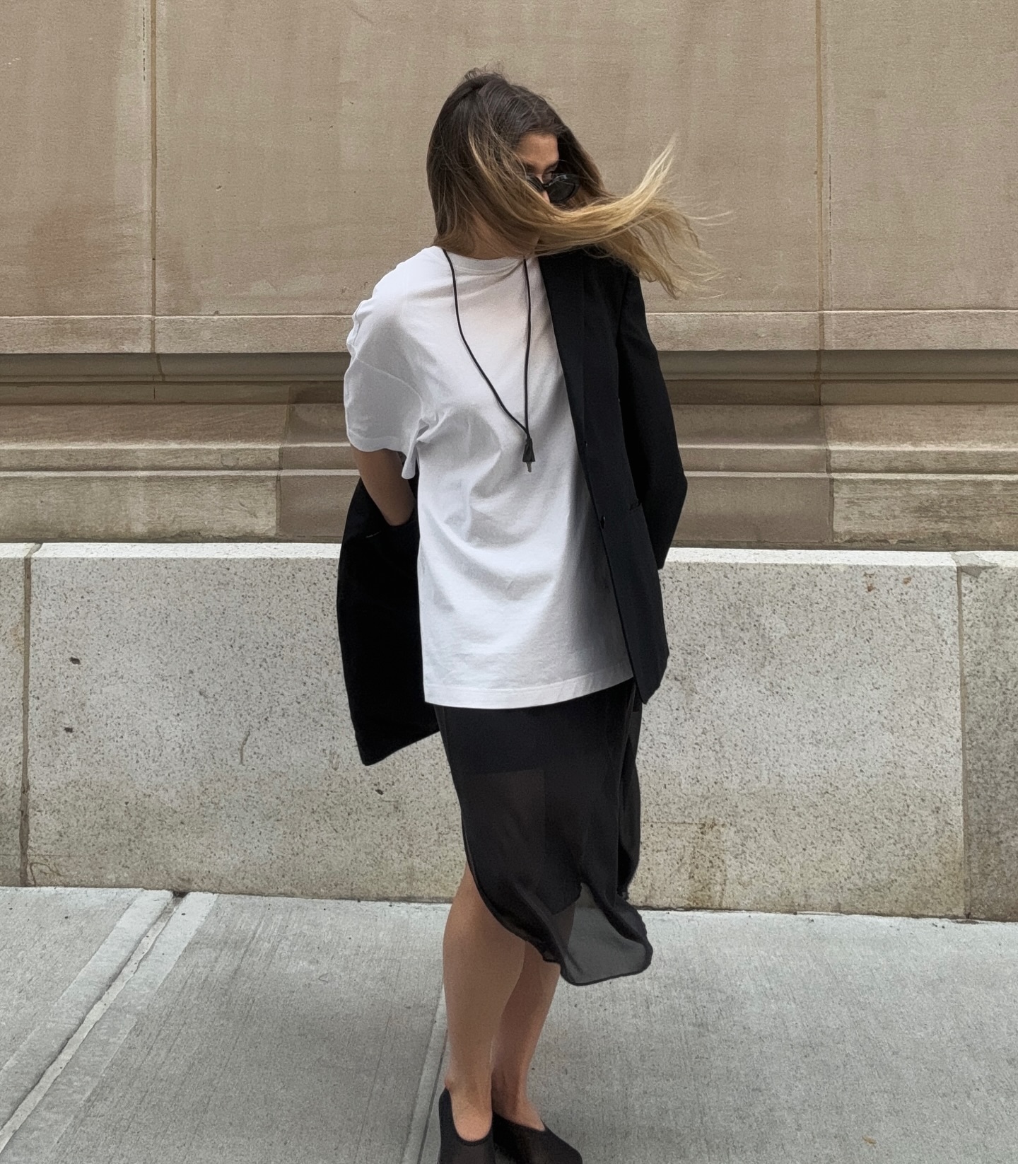 A sheer skirt is one of the most forward pieces to invest in this year. I love the idea of giving the delicate piece a tougher edge by pairing it with a cool oversize tee. Mesh flats and a leather pendant necklace ensure the simple combo is very right now.
