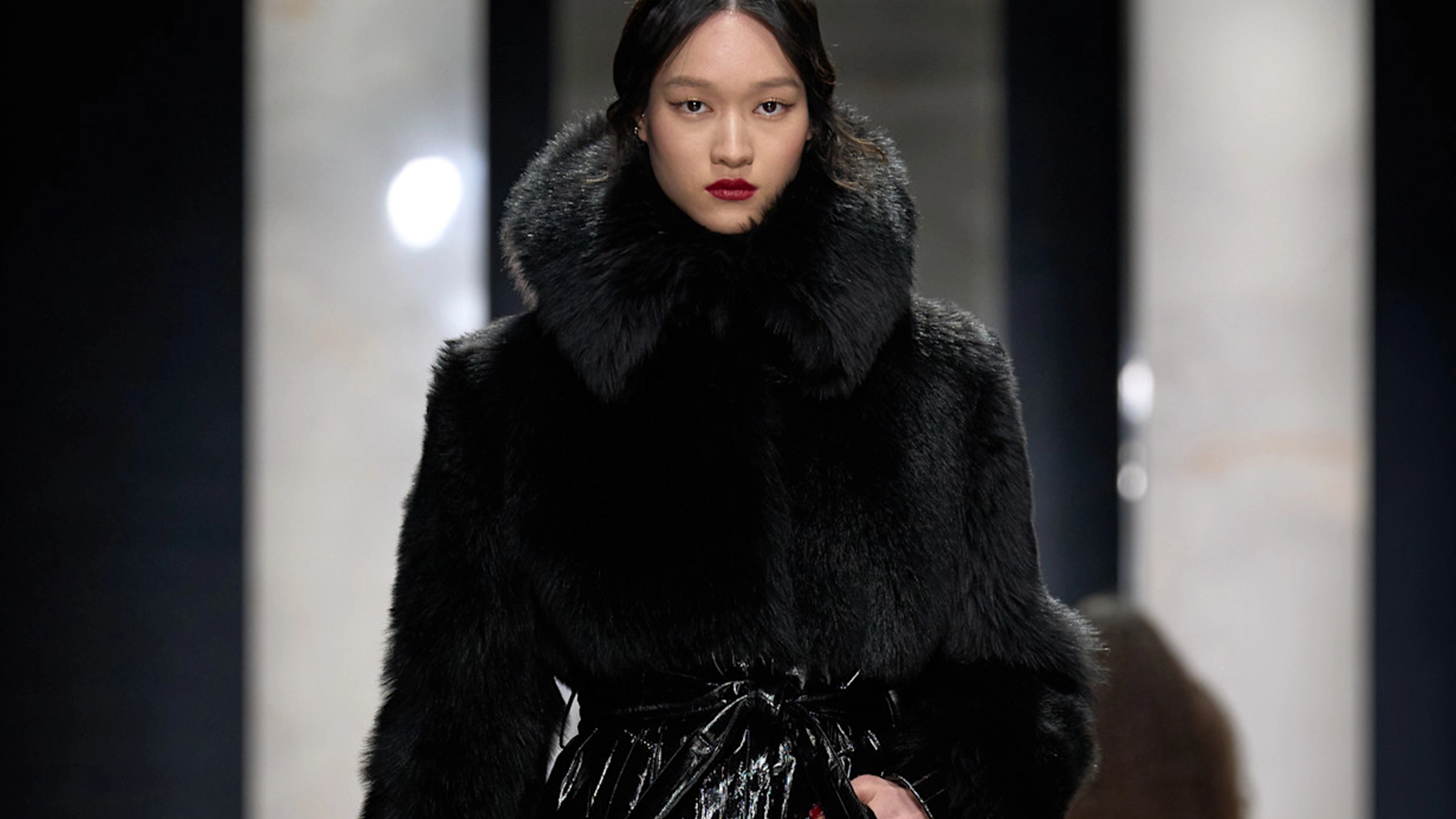 Beauty has always been central to Dolce Gabbana’s storytelling, and fall 2026 sharpened that legacy. The makeup was unapologetically defined: inky eyeliner, sculpted brows, and bold lips in oxblood and deep crimson. Hair was sleek, controlled—often center-parted and smoothed close to the head—once again a nod to the first moments of virality the brand had pre social media days.