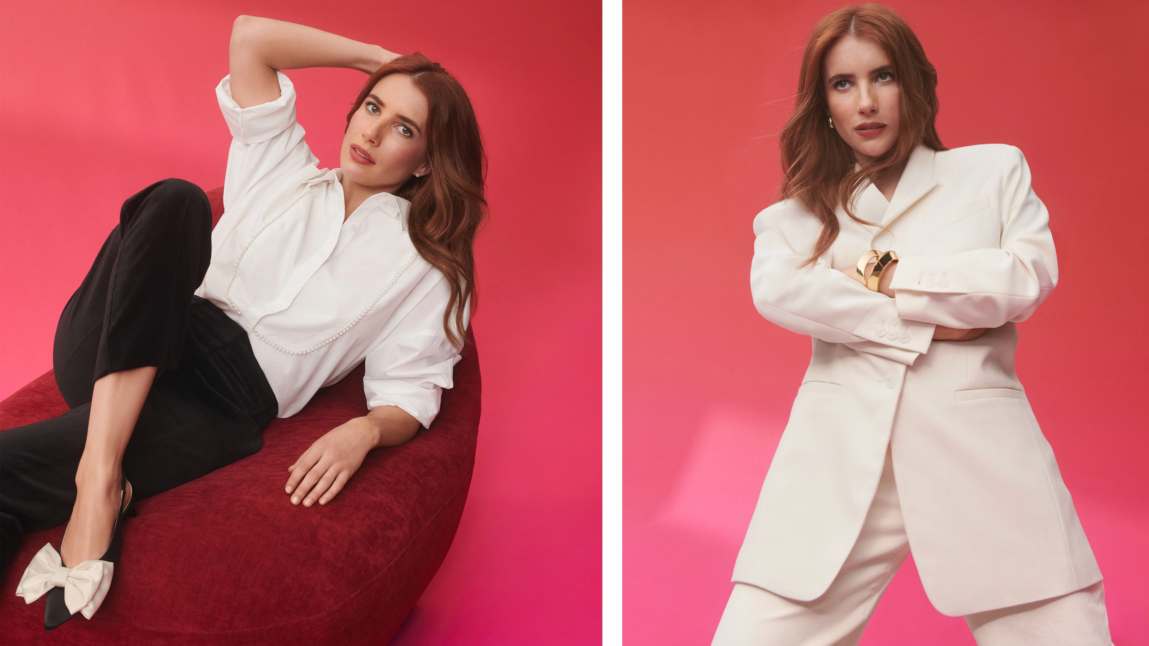 Red Bow Dresses, Velvet Pants, and Tuxedo Shirts—Emma Roberts Shares What She's Wearing This Holiday Season
