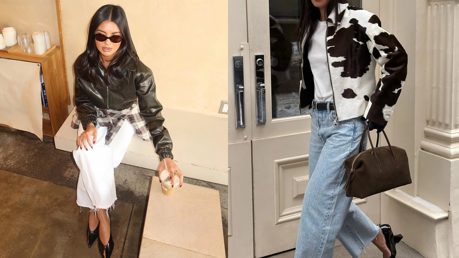 Get the look: Leather jacket + Plaid shirt + White jeans + Patent leather heels