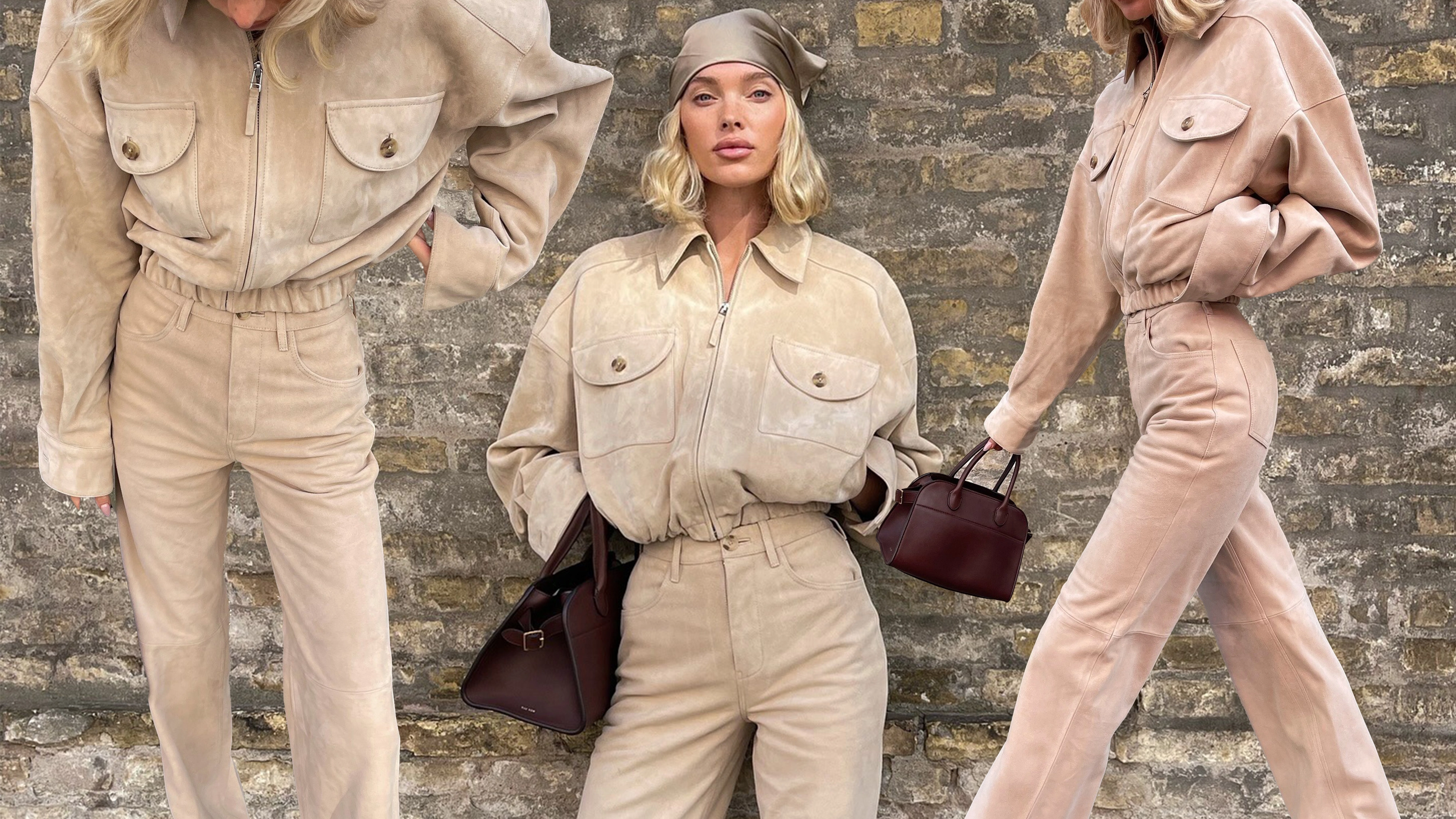 Get the look: Suede matching set + tan boots + silk scarf