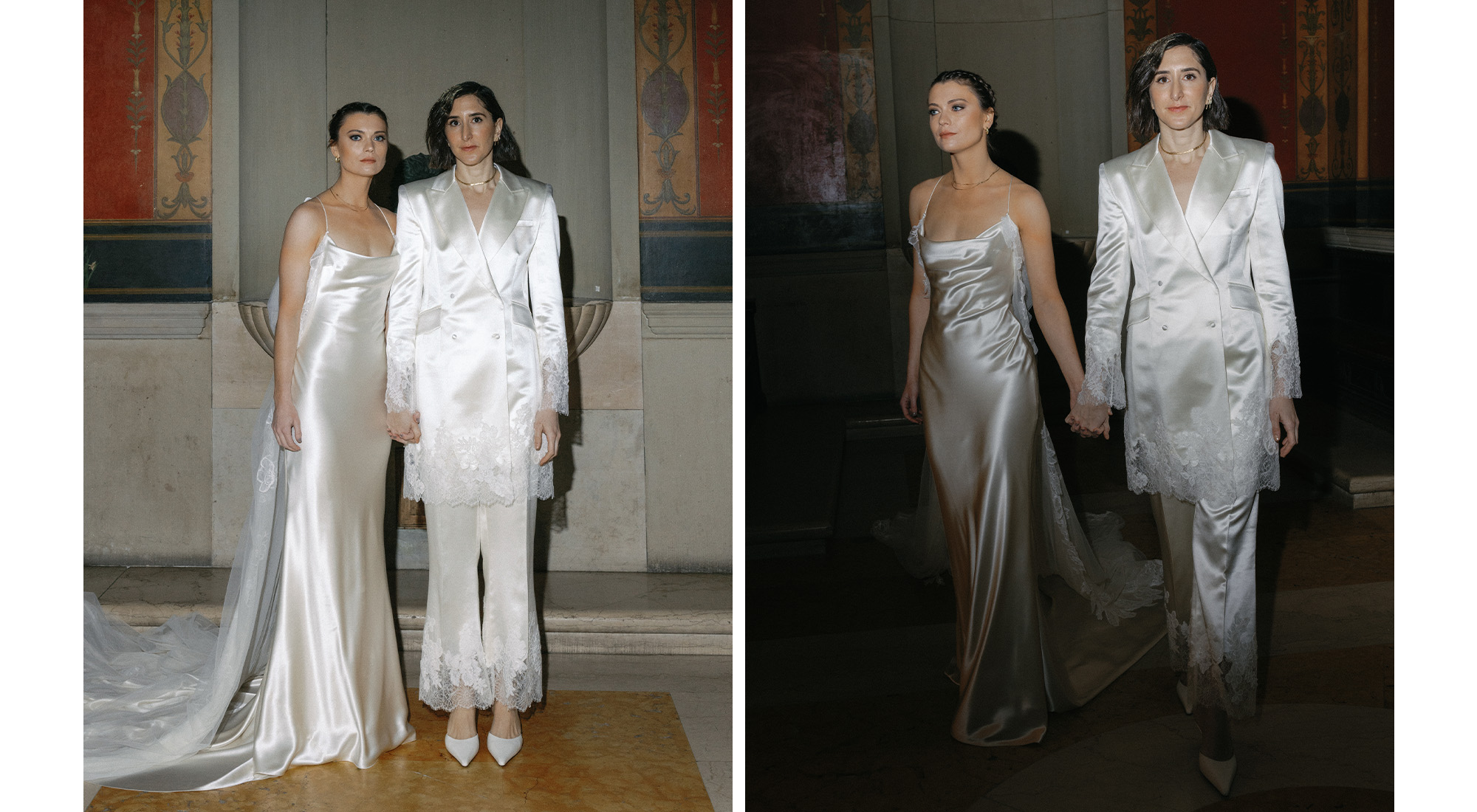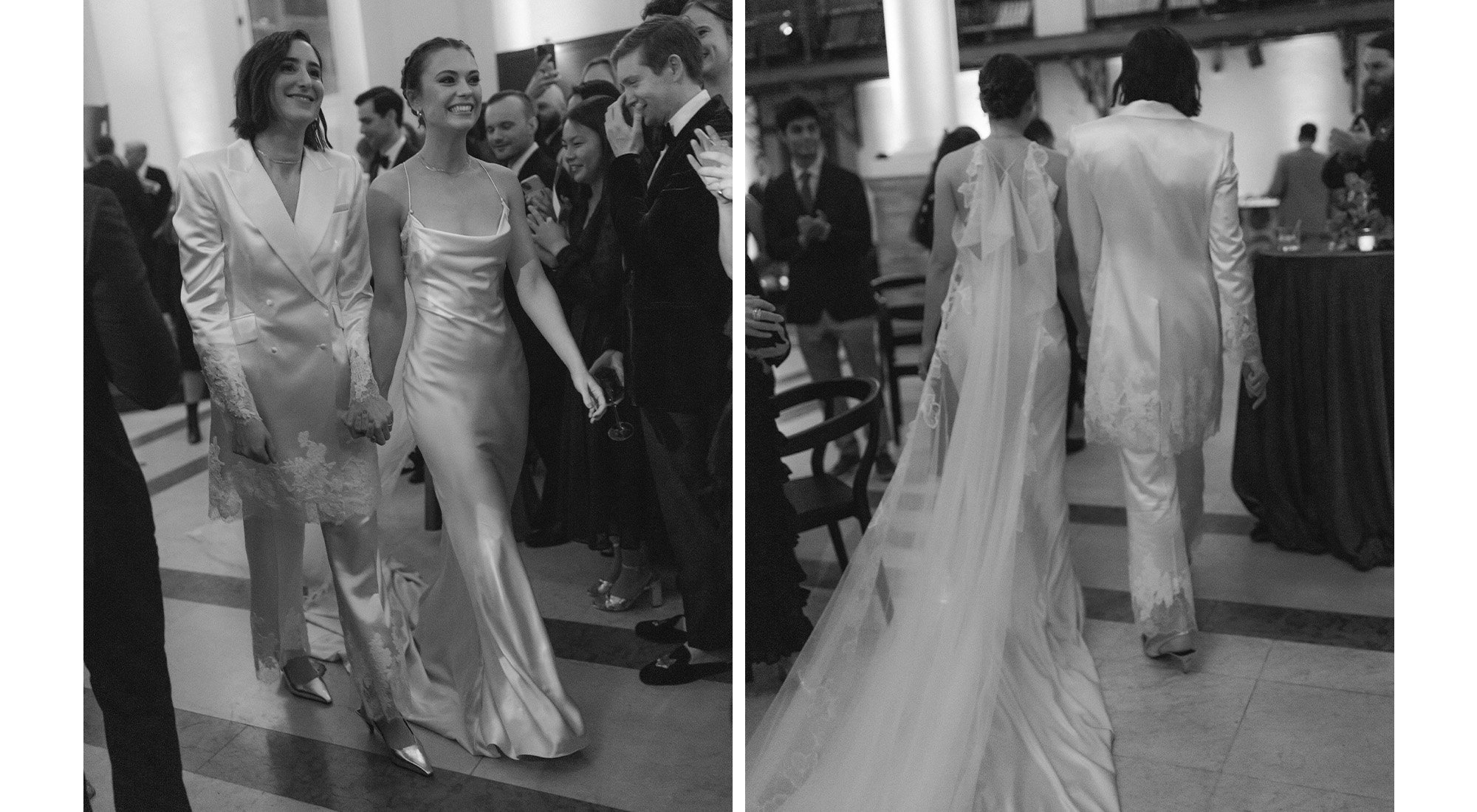 In December 2022, Sacks proposed to Bieg at Twin Farms in Vermont. "Before we went to eat, she held me as we looked at the view and then asked me to marry her. She didn't go down on one knee, and I thought she was joking. It wasn't until she pulled out the ring that I realized she meant it," remembers Bieg. "It took her a little while to settle into it. I had told her I was way too busy to propose and she would have to do it, but that was all part of my plan," Sacks recalls. Six months later, Bieg returned the favor and surprised Sacks with a second proposal during a photo shoot meant to capture the couple in their neighborhood. Their wedding took place on February 10, 2024, at the Boston Public Library. The weekend was filled with a welcome dinner, pre-wedding yoga classes, a surprise ceremony, gorgeous complementary Danielle Frankel bridal looks, and endless unique design details that made this wedding so exceptional.