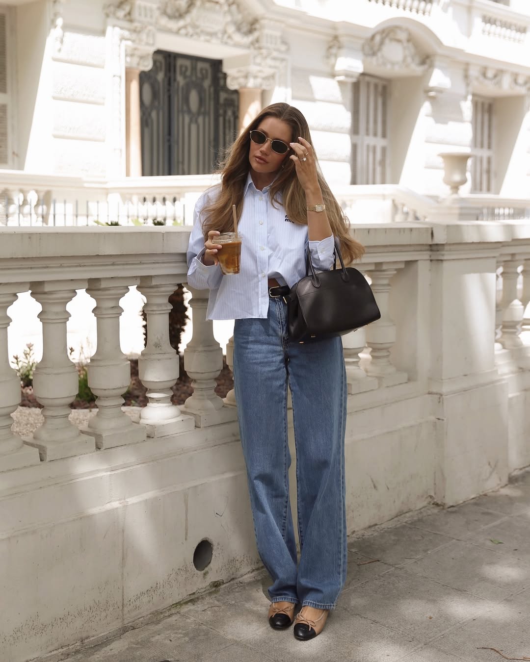 These are full-length jeans with a trouser-like wide leg and a high rise. We know that wide-leg jeans can be intimidating if you're not used to wearing them already, but they are extremely flattering, comfortable and so easy to dress up or down depending on the occasion. For casual days a simple tank or t-shirt and some suede sandals are enough for a clean and out-together look. However, this specific denim style will also pair just as well with a statement top and sling-back heels for more formal occasions.