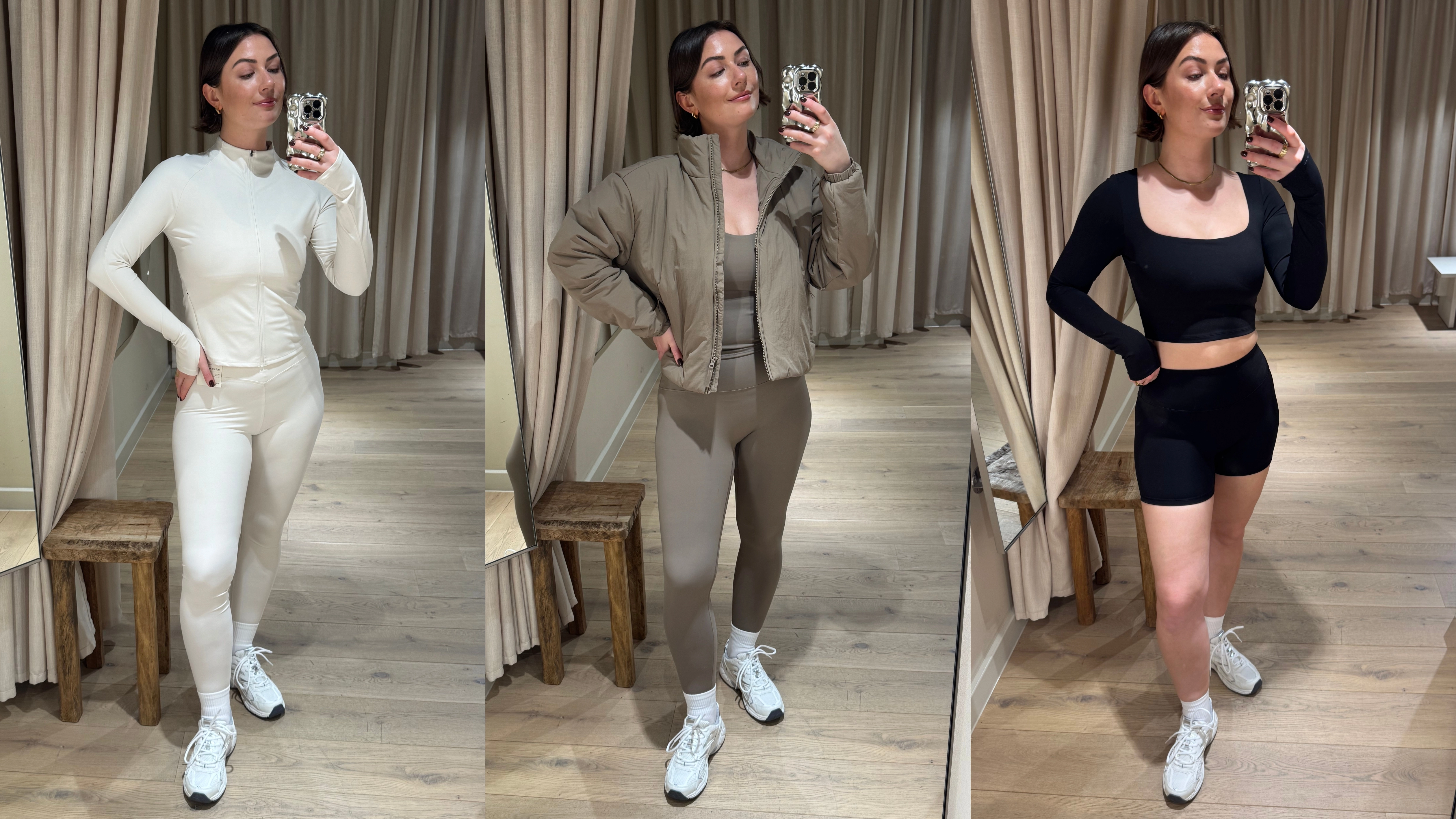 I tried on the Sculptmove Sports Vest Top and matching High-Waisted Leggings (having already loved them in the ivory colourway), and teamed them with the corresponding Water-Repellent Padded Sports Jacket, which was a true match in colour (a win!). There's even a two-pack of wrist weights in the same beige tone, so you can add a bit of resistance to your workout, stylishly.